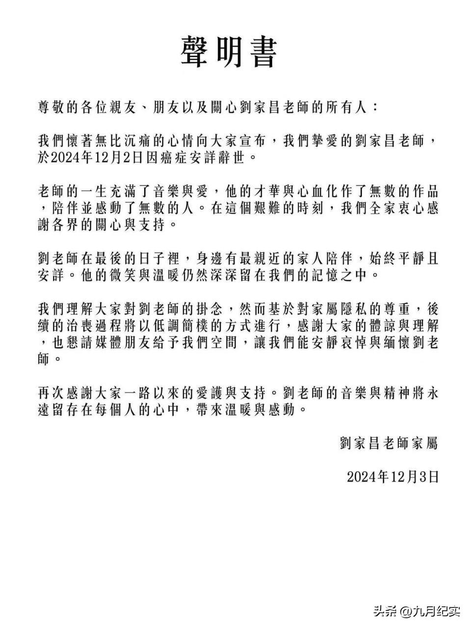 12月3日,臺媒報道知名音樂家劉家昌2日在香港去世,享年81歲。