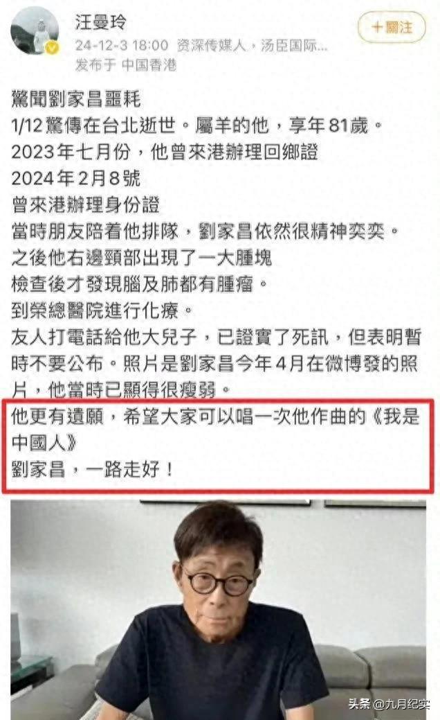 同時,汪曼玲也在社交平臺上公開了劉家昌最後一個遺願,這個遺願也是讓很多人都感到唏噓不已。