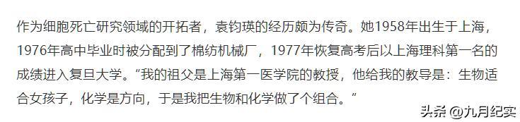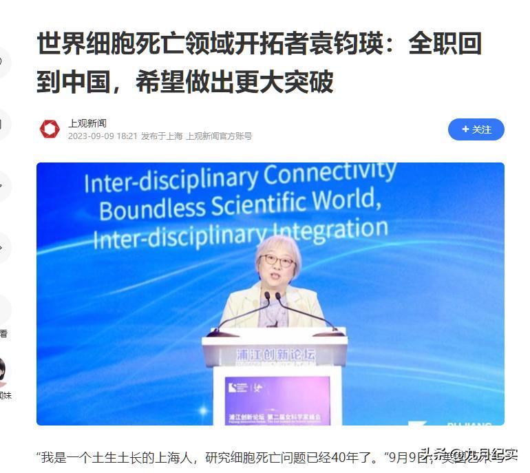 上觀新聞2023-09-09報道:世界細胞死亡領域開拓者袁鈞瑛:全職回到中國,希望做出更大突破