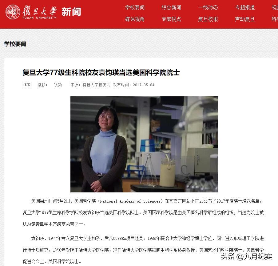 復旦大學77級生科院校友袁鈞瑛當選美國科學院院士