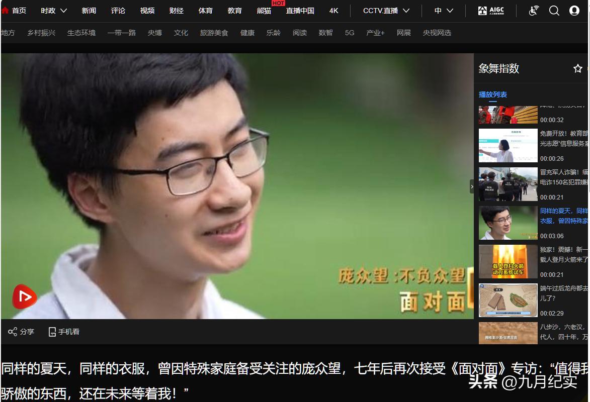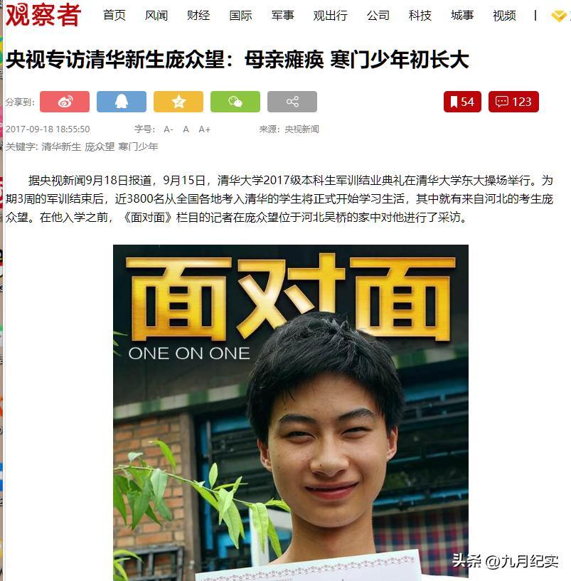 觀察者網2017-09-16報道:央視專訪清華新生龐衆望:母親癱瘓 寒門少年初長大