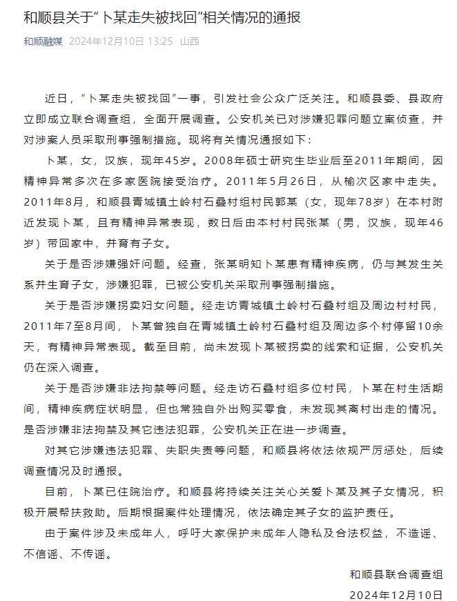 12月3日,當地政府發了一份警情通報,大概意思是說女碩士卜某自從2011年離家走失後,被當地居民張某收留。