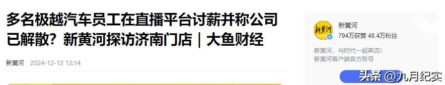 新黃河2024-12-12 12:14報道:多名極越汽車員工在直播平臺討薪並稱公司已解散?新黃河探訪濟南門店|大魚財經