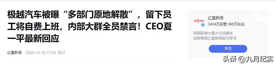 紅星新聞2024-12-12 17:32報道:極越汽車被曝“多部門原地解散”,留下員工將自費上班,內部大羣全員禁言!CEO夏一平最新回應
