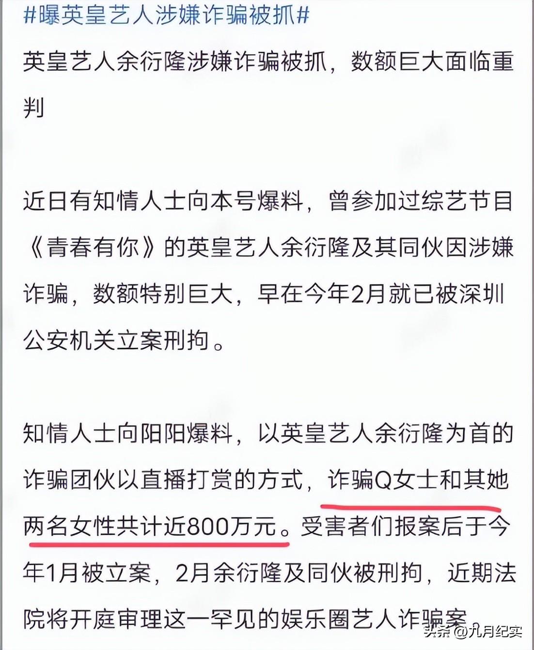 然而,餘衍隆卻被網友曝光,說他在因涉嫌詐騙近800萬而被警方刑拘調查。