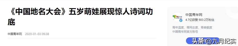 中國青年網2020-01-03 09:38報道:《中國地名大會》五歲萌娃展現驚人詩詞功底
