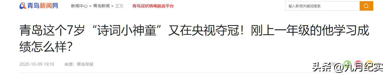 青島早報2020-10-09報道:青島這個7歲“詩詞小神童”又在央視奪冠!剛上一年級的他學習成績怎麼樣?