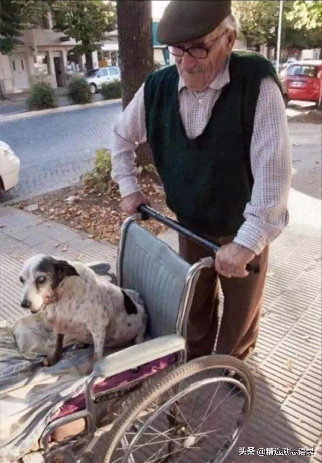 年邁的老爺爺正推着坐輪椅的狗狗遛彎。