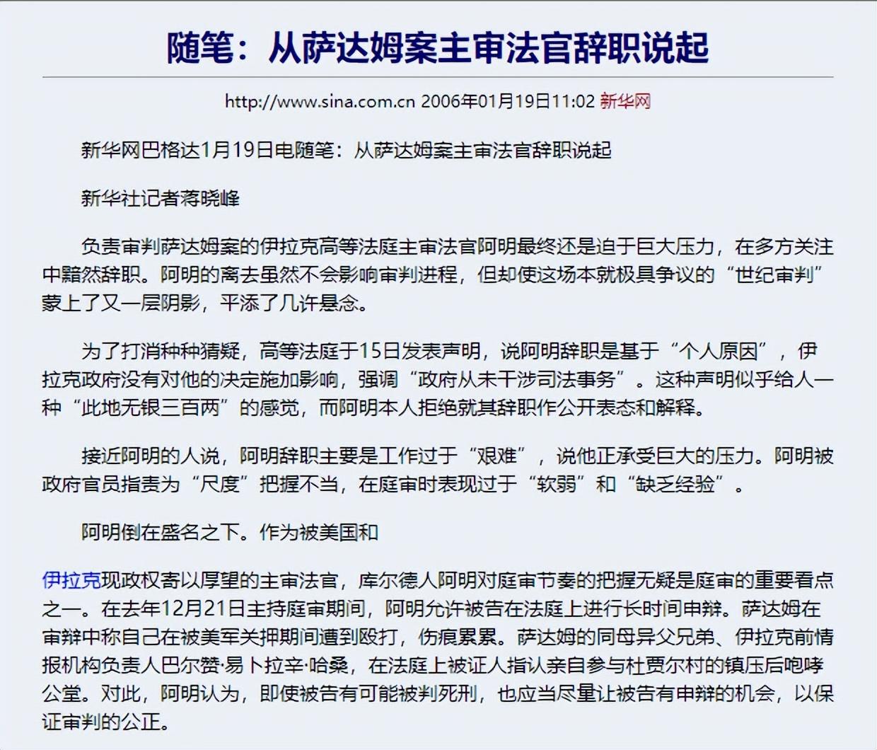 新華網2006年01月19日11:02 報道:隨筆:從薩達姆案主審法官辭職說起
