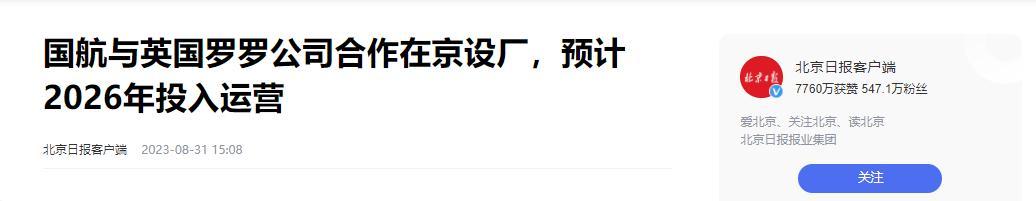 北京日報客戶端2023-08-31 15:08報道:國航與英國羅羅公司合作在京設廠,預計2026年投入運營