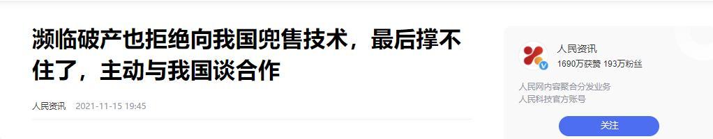 人民資訊2021-11-15 19:45報道:瀕臨破產也拒絕向我國兜售技術,最後撐不住了,主動與我國談合作
