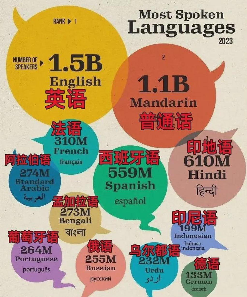 其中西班牙語是由於現在很多拉丁美洲的國家使用西班牙語,人數只在英語和漢語之下。