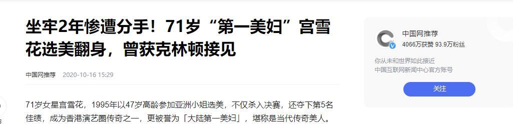 中國網推薦2020-10-16 15:29報道:坐牢2年慘遭分手!71歲“第一美婦”宮雪花選美翻身,曾獲克林頓接見