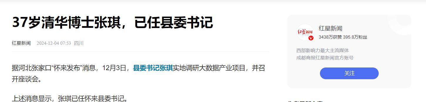 紅星新聞2024-12-04 07:53報道:37歲清華博士張琪,已任縣委書記