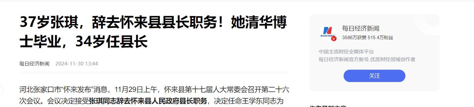 每日經濟新聞2024-11-30 13:44報道:37歲張琪,辭去懷來縣縣長職務!她清華博士畢業,34歲任縣長