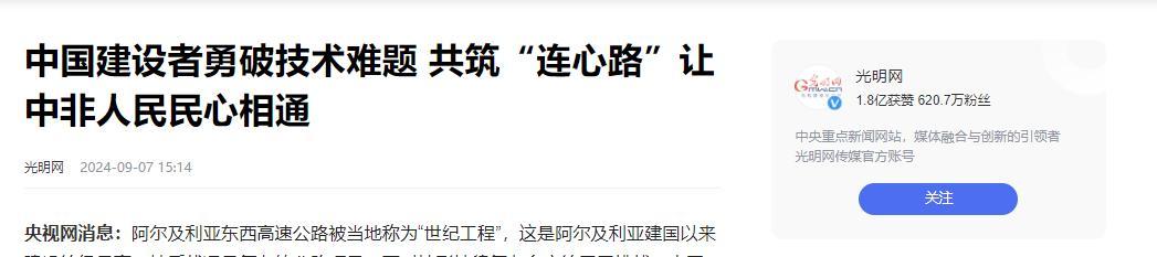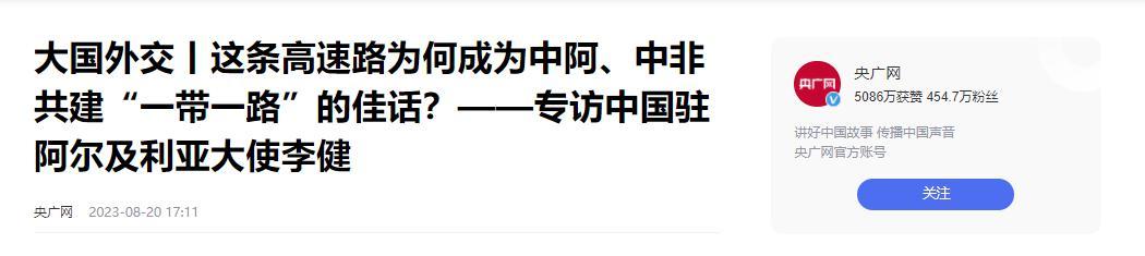 央廣網2023-08-20 17:11報道:大國外交丨這條高速路爲何成爲中阿、中非共建“一帶一路”的佳話?——專訪中國駐阿爾及利亞大使李健