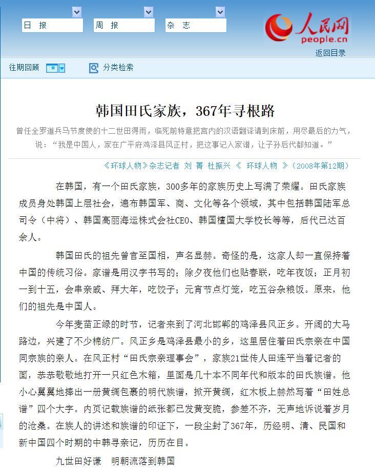 環球人物 2008年第12期報道:韓國田氏家族,367年尋根路