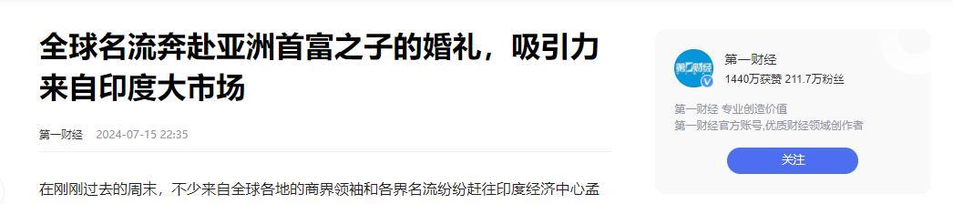 第一財經2024-07-15 22:35報道:全球名流奔赴亞洲首富之子的婚禮,吸引力來自印度大市場