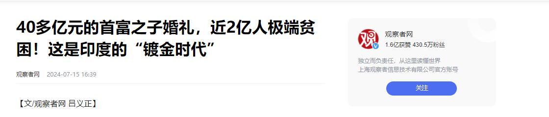 觀察者網2024-07-15 16:39報道:40多億元的首富之子婚禮,近2億人極端貧困!這是印度的“鍍金時代”