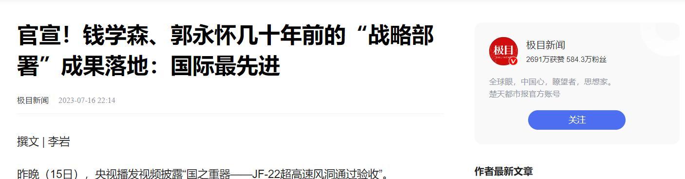 極目新聞2023-07-16 22:14報道:官宣!錢學森、郭永懷幾十年前的“戰略部署”成果落地:國際最先進