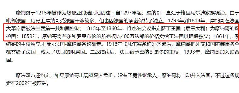 摩納哥面積最大的時候也才20平方千米,並且沒有趕上工業革命這場東風,導致它被強大的國家殖民。