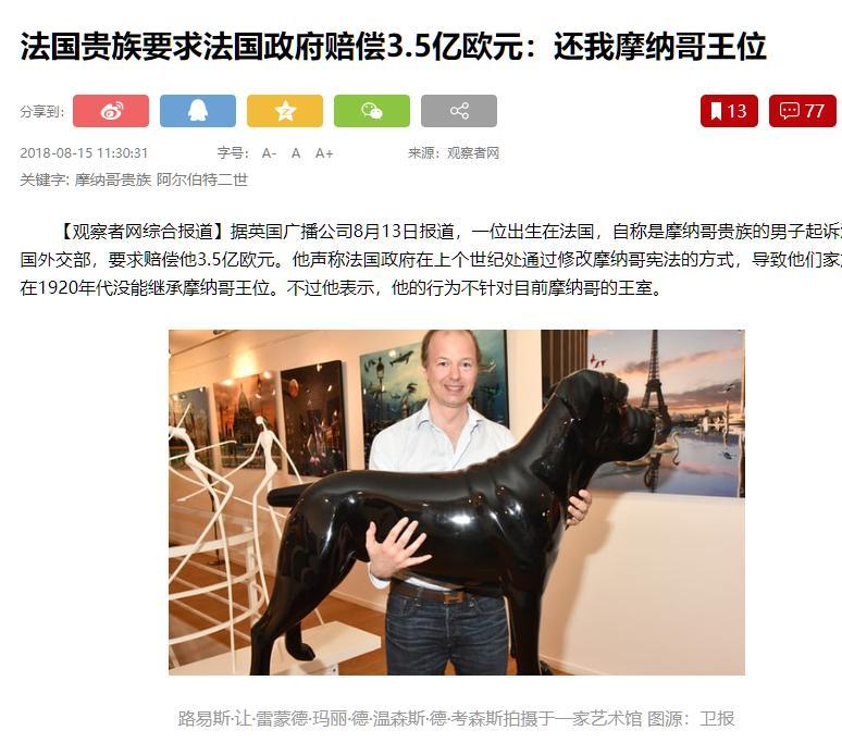 觀察者網2018-08-15 16:16報道:法國貴族要求法國政府賠償3.5億歐元:還我摩納哥王位