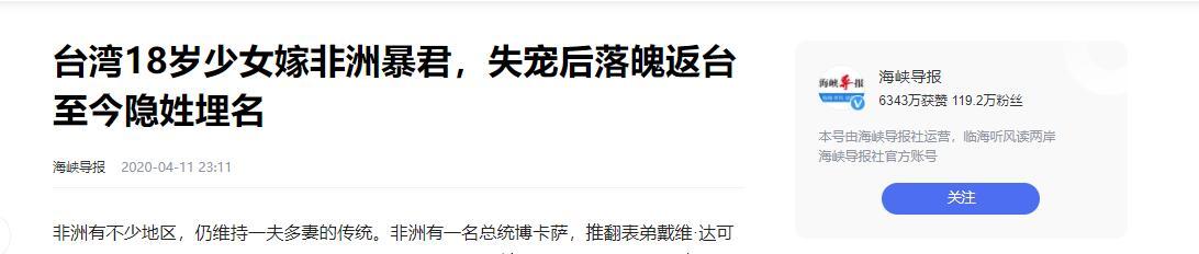海峽導報2020-04-11 23:11報道:臺灣18歲少女嫁非洲暴君,失寵後落魄返臺至今隱姓埋名
