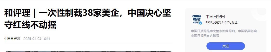 中國日報網2025-01-03 16:41報道:和評理|一次性制裁38家美企,中國決心堅守紅線不動搖