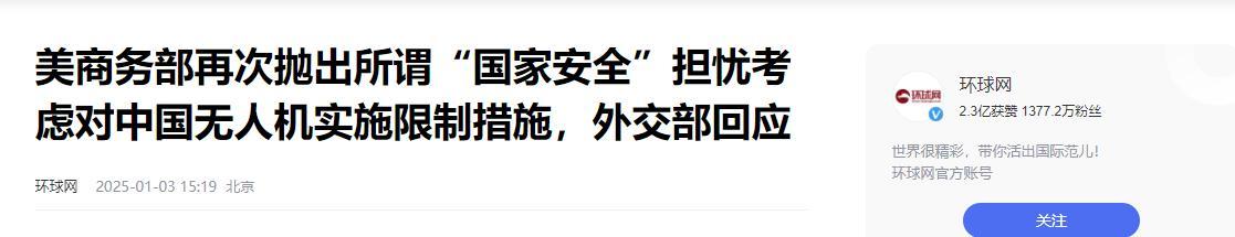 環球網2025-01-03 15:19報道:美商務部再次拋出所謂“國家安全”擔憂考慮對中國無人機實施限制措施,外交部回應