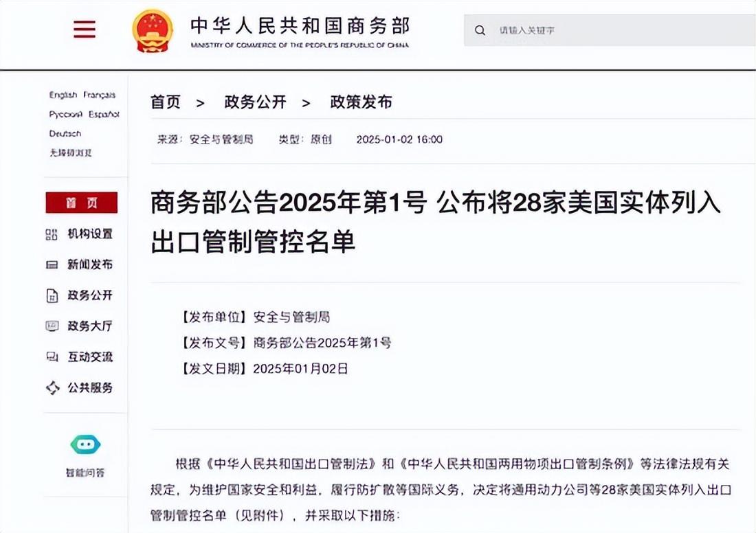 並且,也是在同一天,中國商務部再次發佈聲明,根據相關規定,爲了維護我國分安全和利益,決定將28家美國實體納入出口管制管控名單。