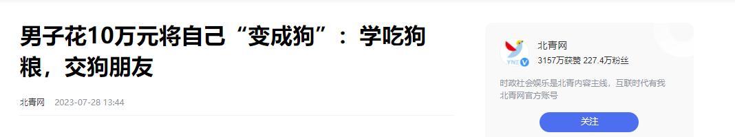 北青網2023-07-28 13:44報道:男子花10萬元將自己“變成狗”:學喫狗糧,交狗朋友