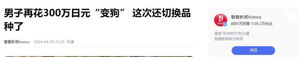 看看新聞Knews2024-04-29 21:25報道:男子再花300萬日元“變狗” 這次還切換品種了