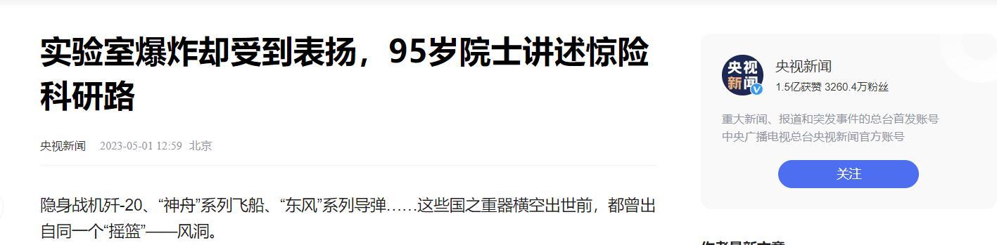 央視新聞2023-05-01 12:59報道:實驗室爆炸卻受到表揚,95歲院士講述驚險科研路