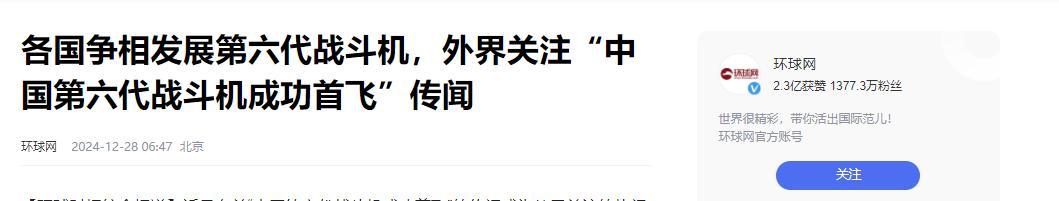 環球網2024-12-28 06:47報道:各國爭相發展第六代戰鬥機,外界關注“中國第六代戰鬥機成功首飛”傳聞