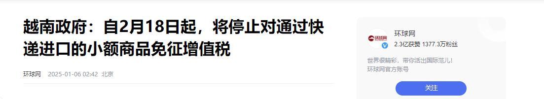 這項政策宣稱從2月18日,越南將取消對低價進口商品的免稅。