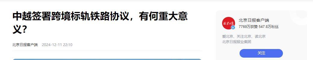 北京日報客戶端2024-12-11 22:10報道:中越簽署跨境標軌鐵路協議,有何重大意義?
