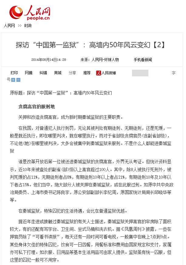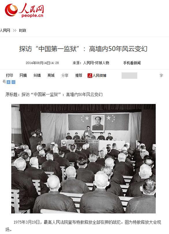 人民網2014年08月14日發佈:探訪“中國第一監獄”:高牆內50年風雲變幻