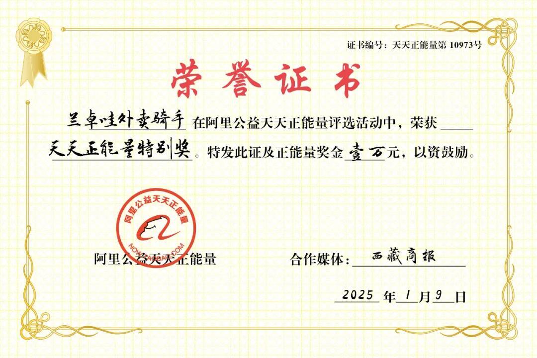 阿里公益天天正能量聯合西藏商報,爲蘭卓哇外賣騎手頒發正能量特別獎及獎金10000元。