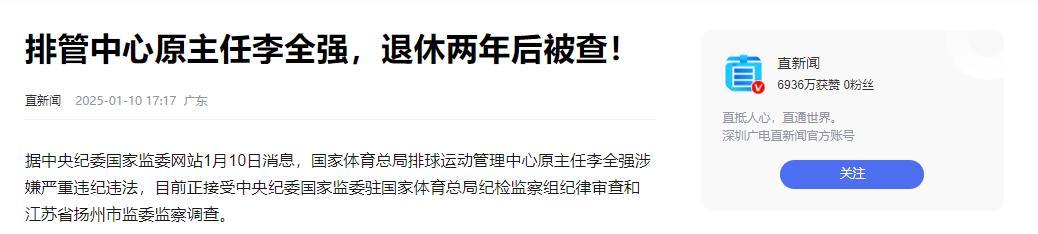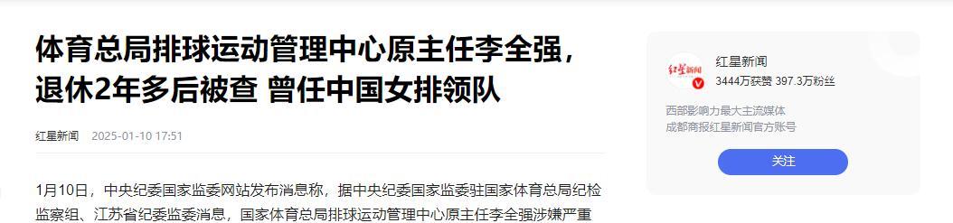 紅星新聞2025-01-10 17:51報道:體育總局排球運動管理中心原主任李全強,退休2年多後被查 曾任中國女排領隊