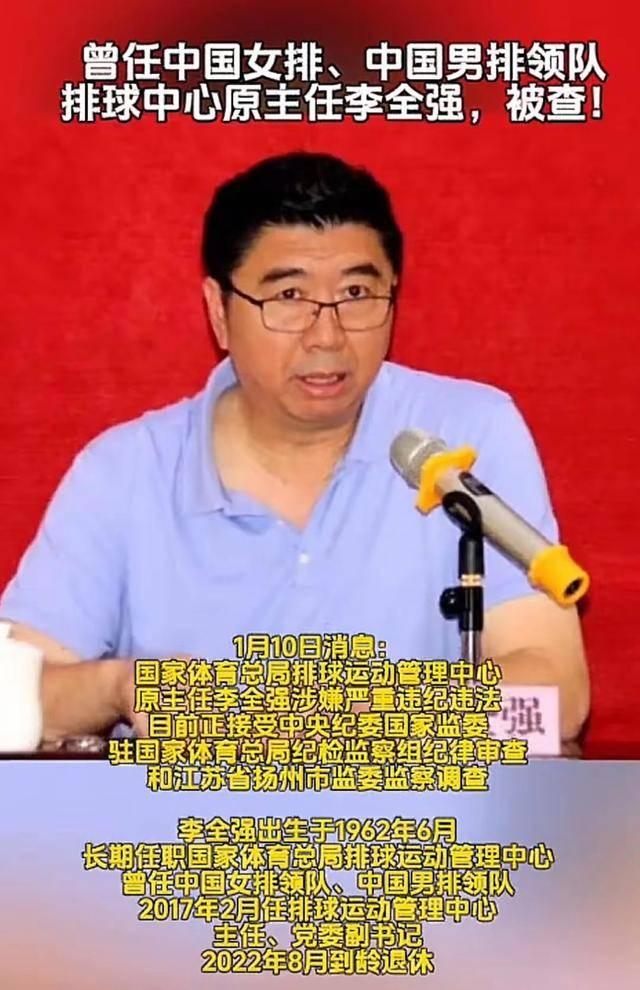 紅星新聞2025-01-10 17:51報道:體育總局排球運動管理中心原主任李全強,退休2年多後被查 曾任中國女排領隊