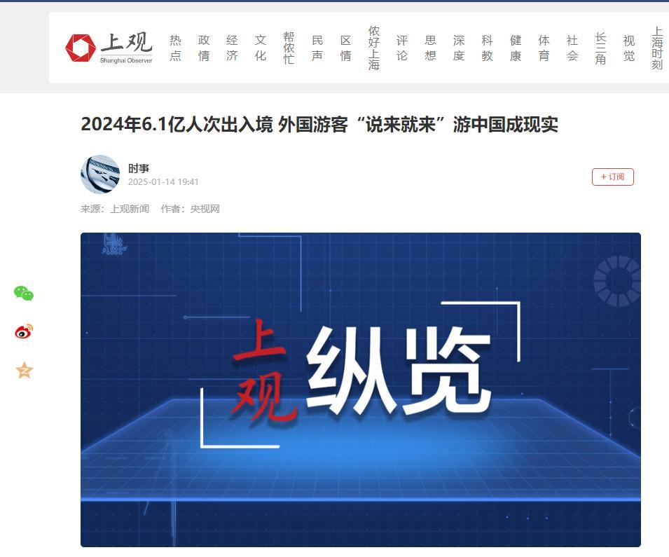 上觀新聞2025-01-14 19:41報道:2024年6.1億人次出入境 外國遊客“說來就來”遊中國成現實