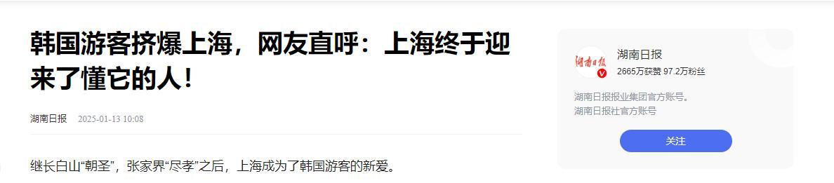 湖南日報2025-01-13 10:08報道:韓國遊客擠爆上海,網友直呼:上海終於迎來了懂它的人!
