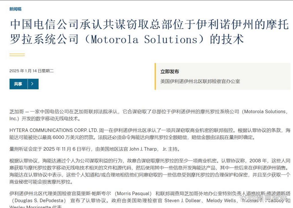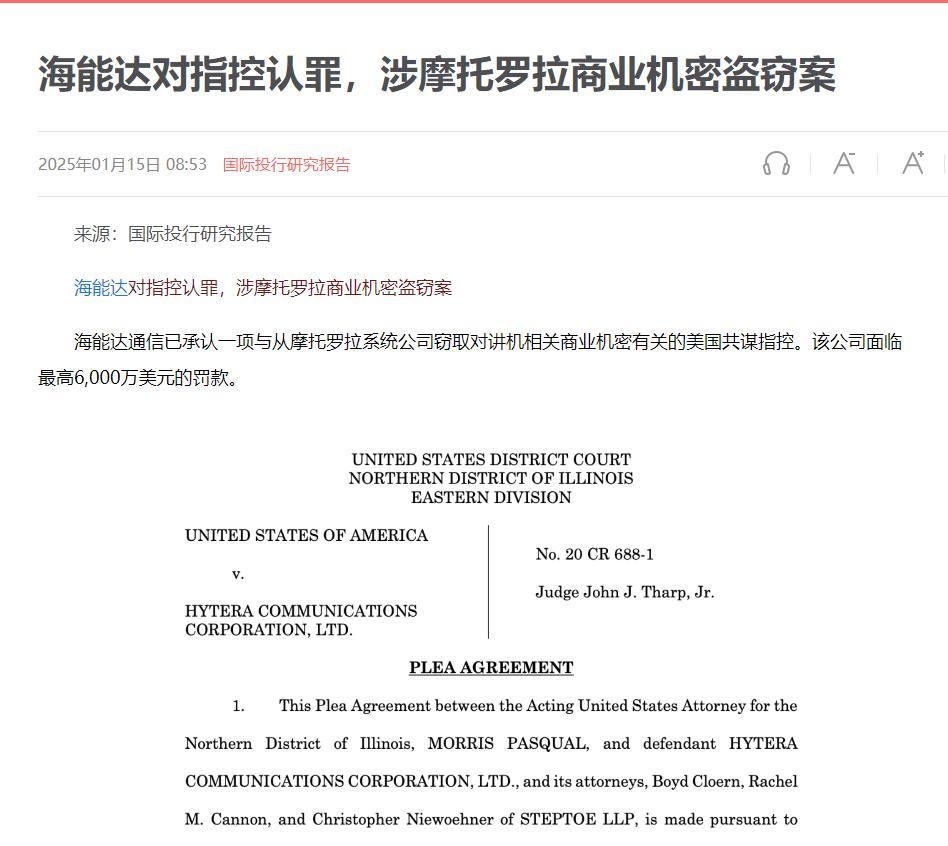 國際投行研究報告報道2025年01月15日 08:53 :海能達對指控認罪,涉摩托羅拉商業機密盜竊案