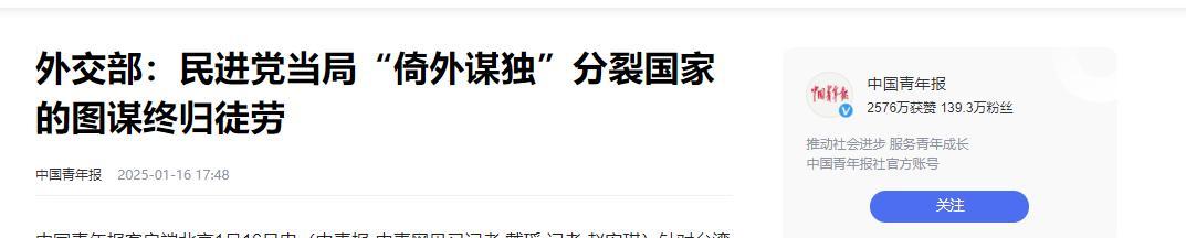 中國青年報2025-01-16 17:48報道:外交部:民進黨當局“倚外謀獨”分裂國家的圖謀終歸徒勞