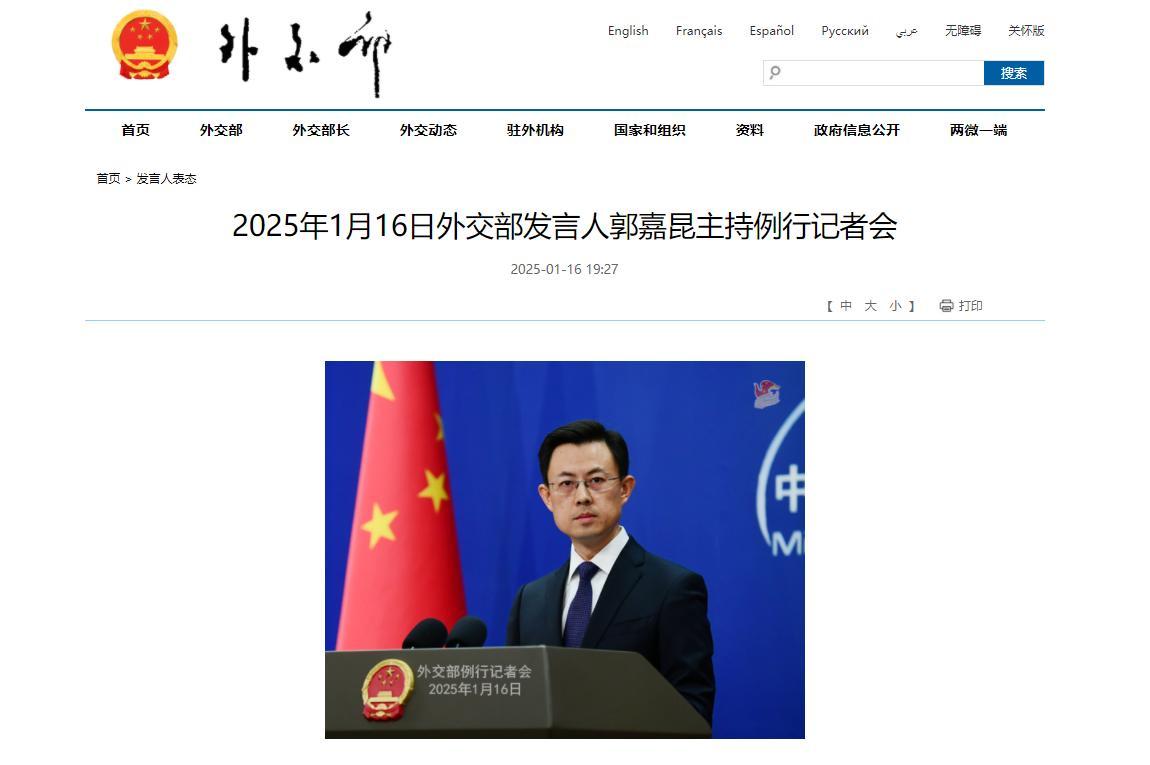 中國外交部2025-01-16 19:27報道:2025年1月16日外交部發言人郭嘉昆主持例行記者會