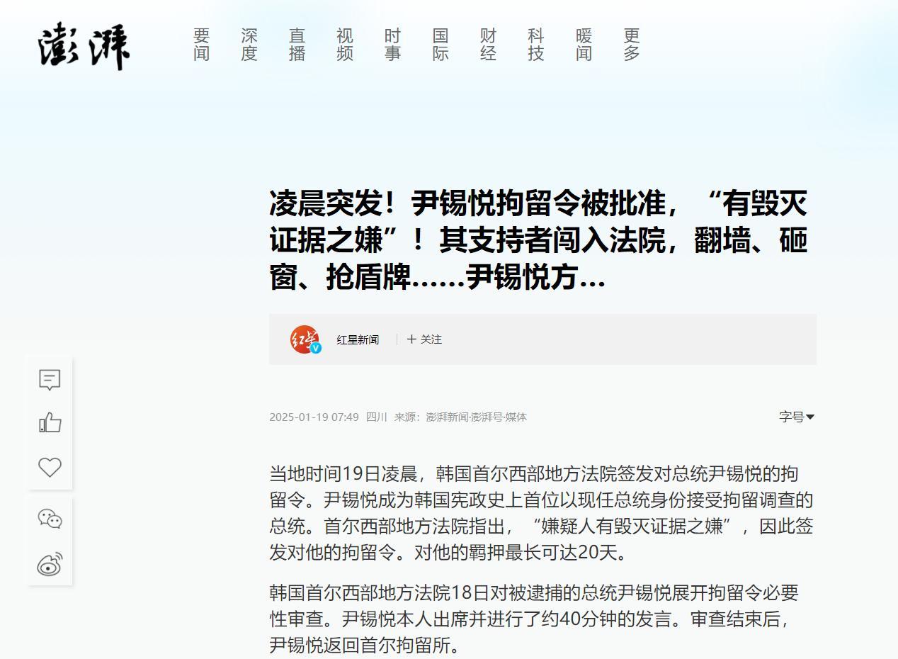 澎湃新聞2025-01-19 07:49報道:凌晨突發!尹錫悅拘留令被批准,“有毀滅證據之嫌”!其支持者闖入法院,翻牆、砸窗、搶盾牌……尹錫悅方…