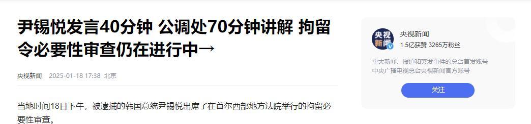 央視新聞2025-01-18 17:38報道:尹錫悅發言40分鐘 公調處70分鐘講解 拘留令必要性審查仍在進行中→