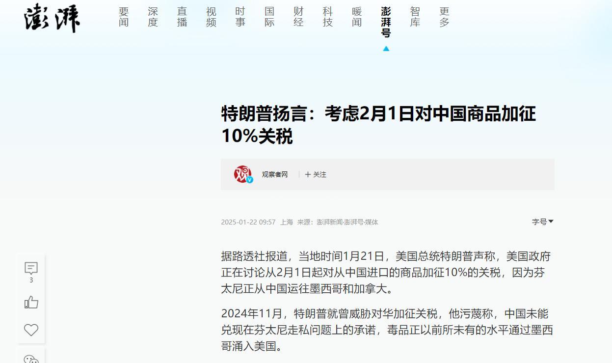 澎拜新聞2025-01-22 09:57報道:特朗普揚言:考慮2月1日對中國商品加徵10%關稅