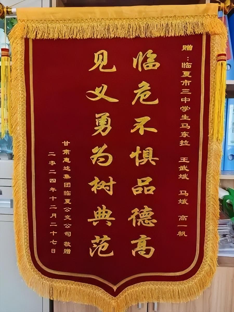 公交公司送來的錦旗上,寫着四個學生的名字。受訪者供圖
