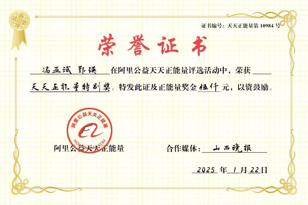 阿里公益天天正能量聯合山西晚報,用一份特別獎,提前爲小店夫妻馮亞斌、鄞瑛送上新春的祝福。